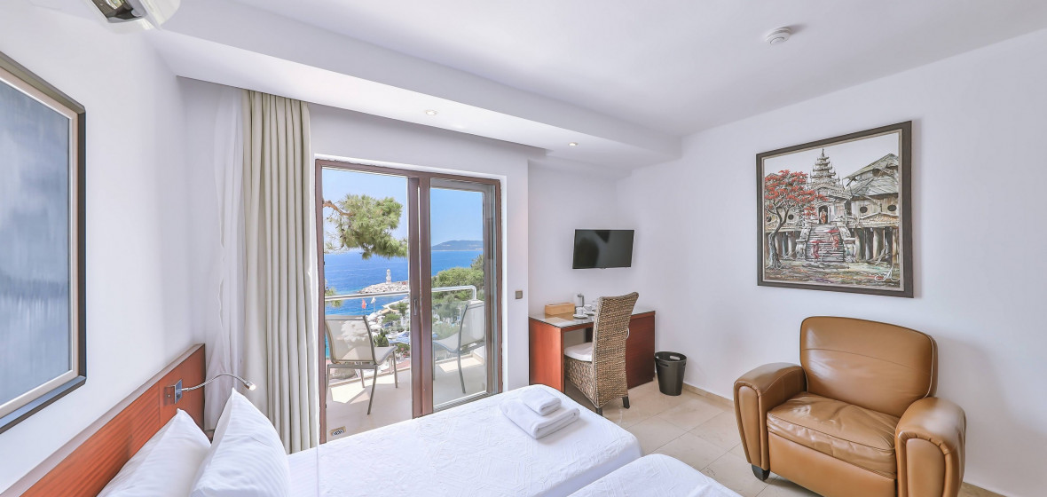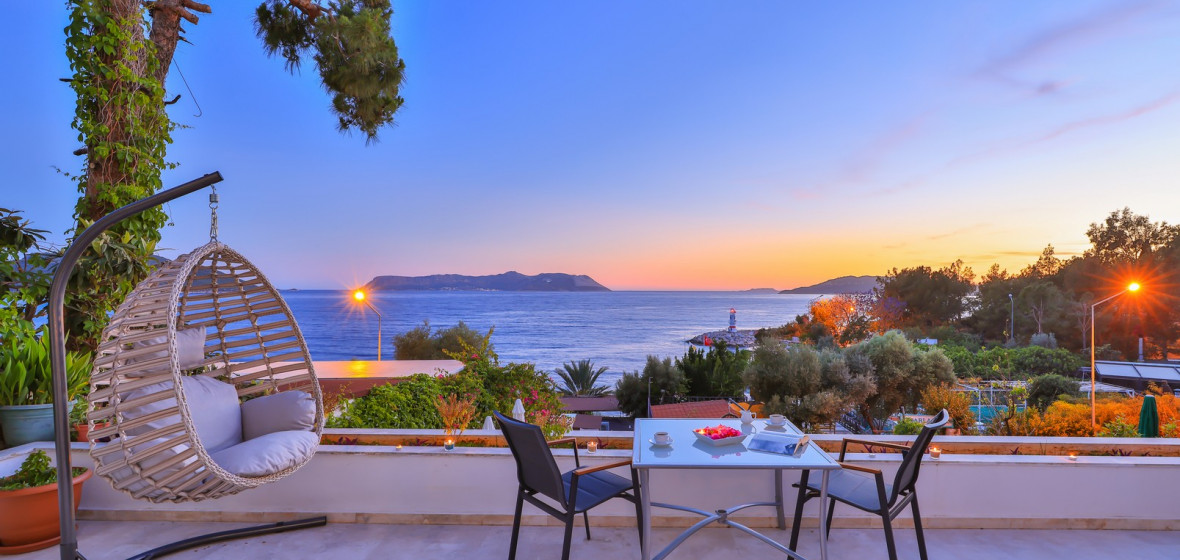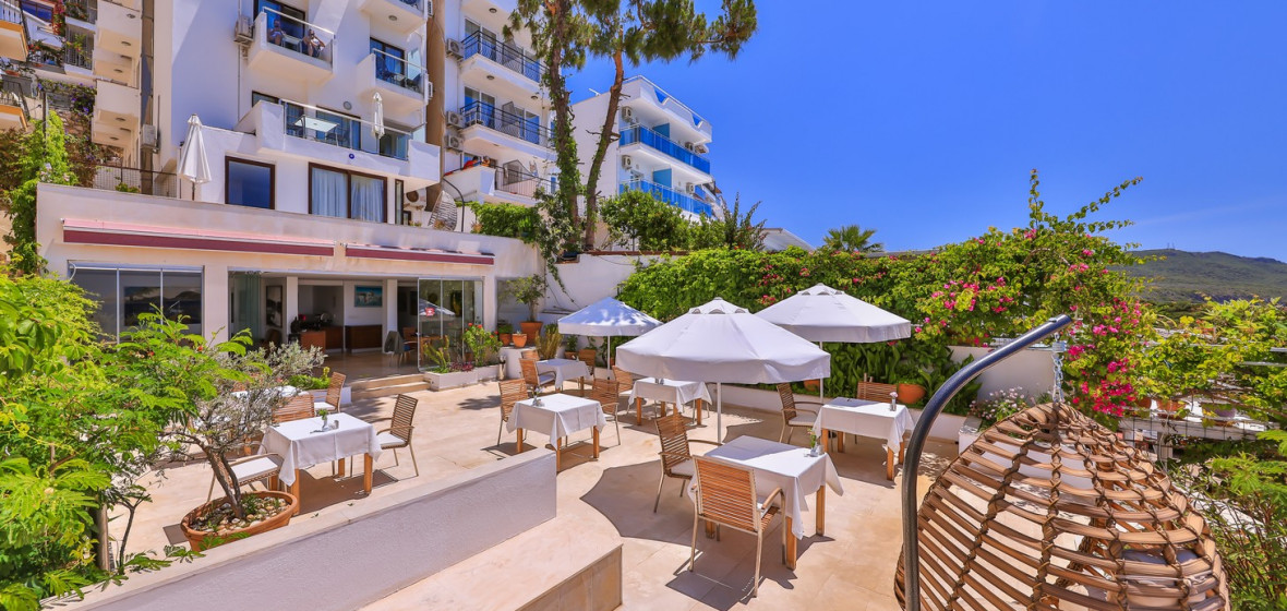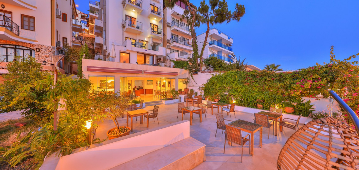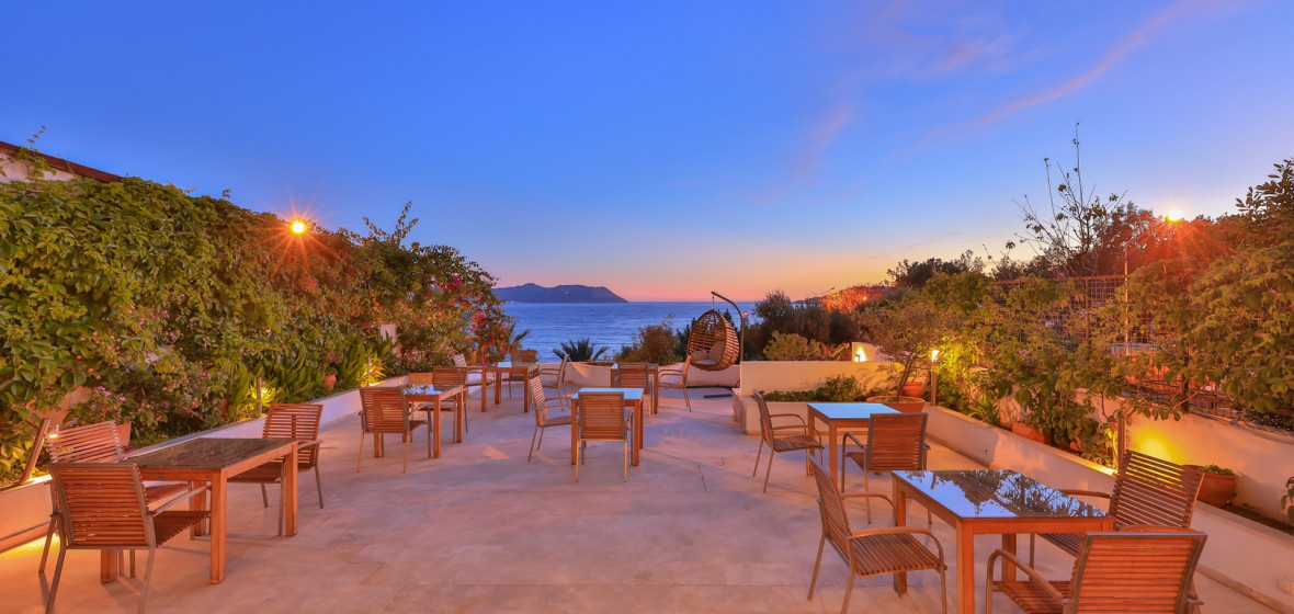 On the east side of Kas’s yacht and fishing boat harbour, just a few hundred yards from the seafront shops, cafés and restaurants, the Gardenia is uncompromisingly modern, with in-room facilities such as minibar, satellite TV, and rain showers. Outside, blue canvas couches and wicker armchairs under white canvas umbrellas overlook the sea on a marble terrace; at sea level, there are sun loungers and access to the clear blue water of the bay. If your budget will stretch, go for a suite with a private sea-view terrace; otherwise, insist on a sea-front room – the standard rooms are perfectly well equipped but lack that extra sparkle that a sea view gives.