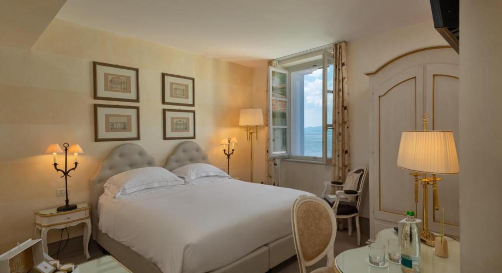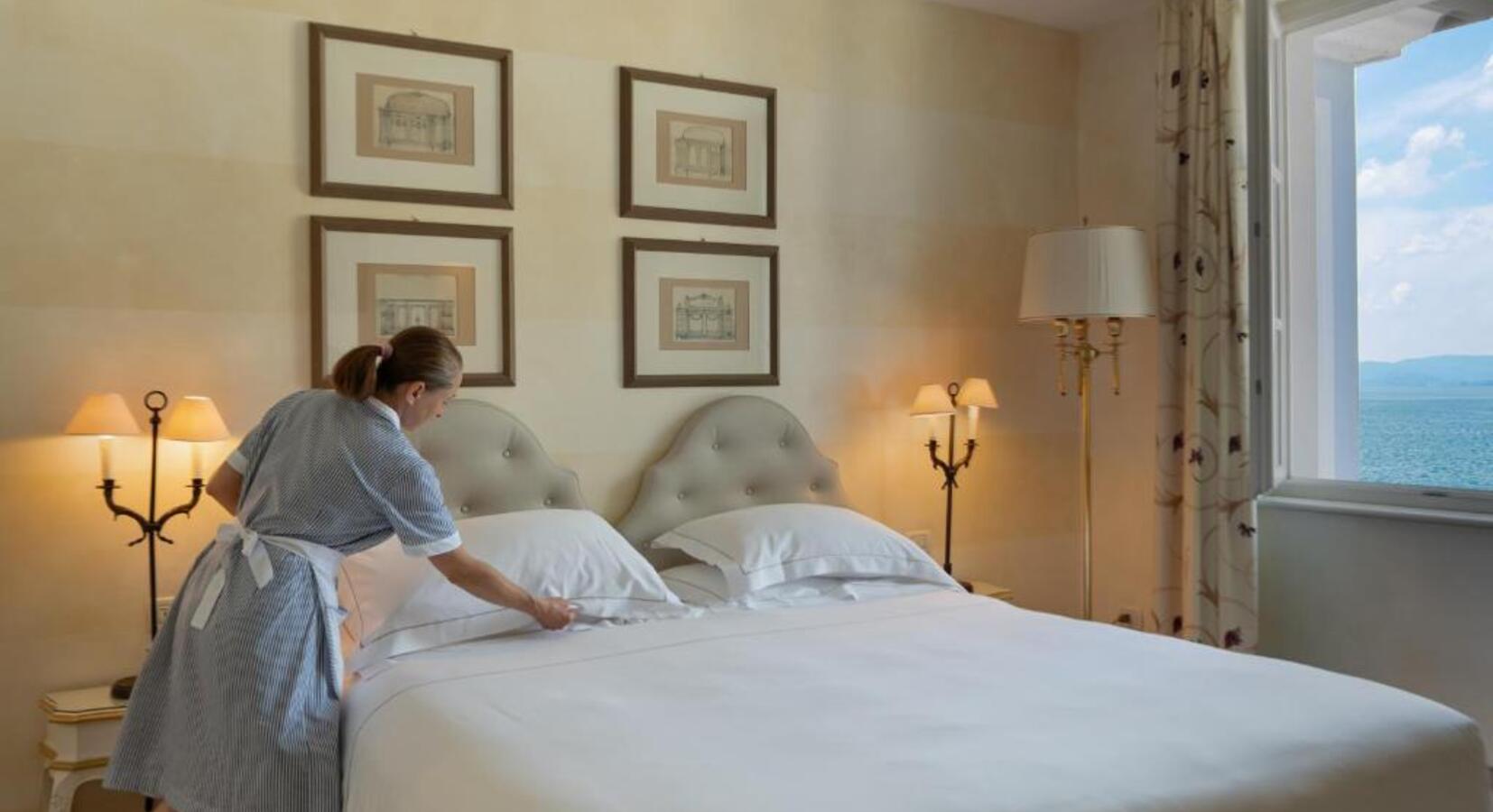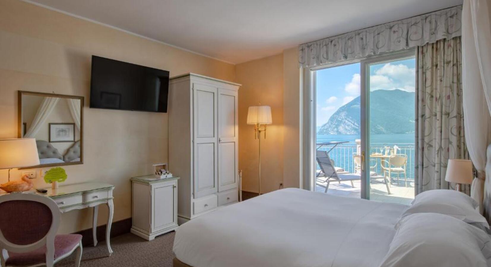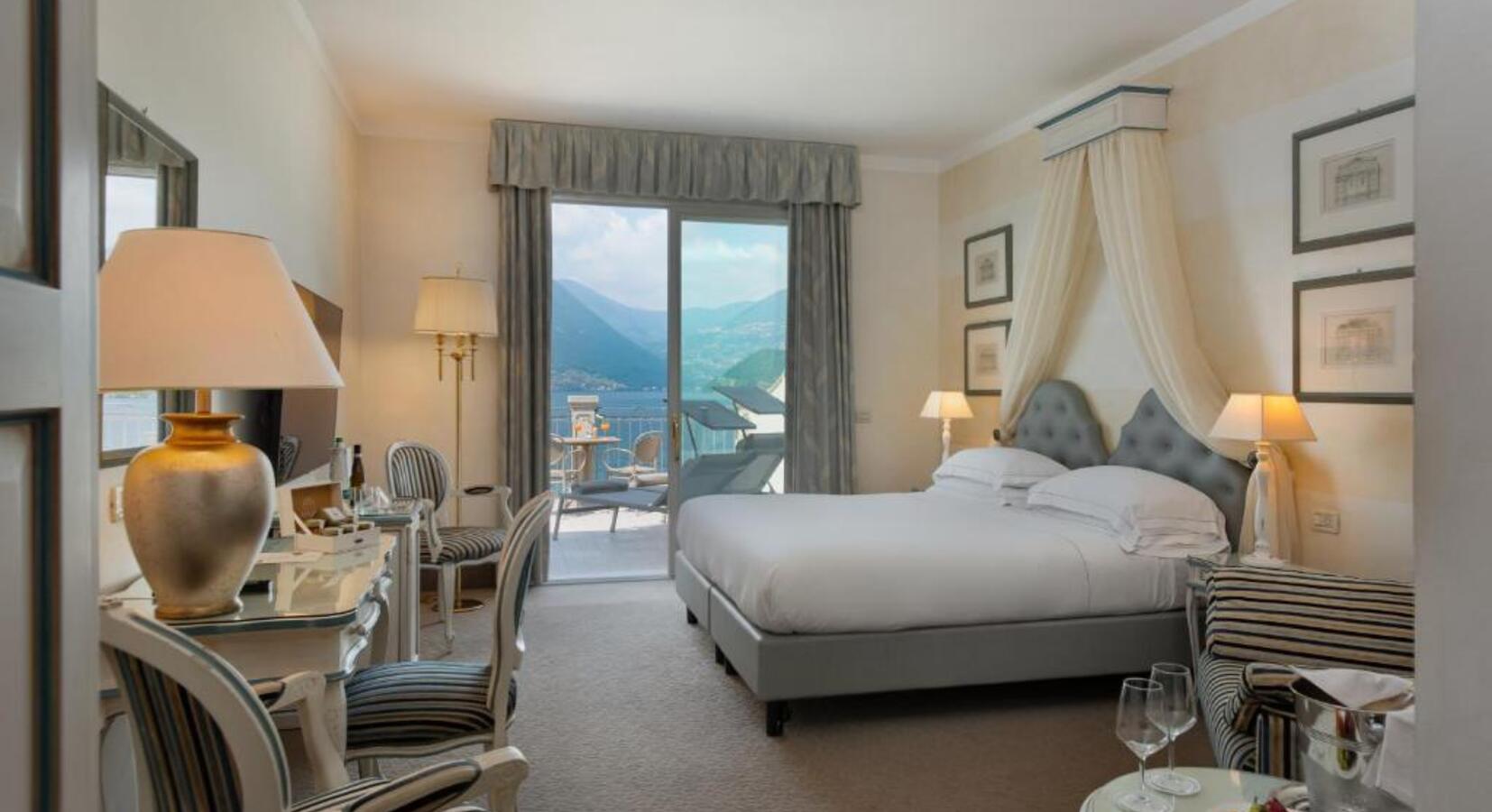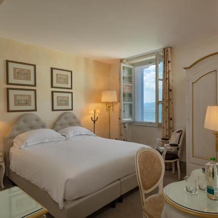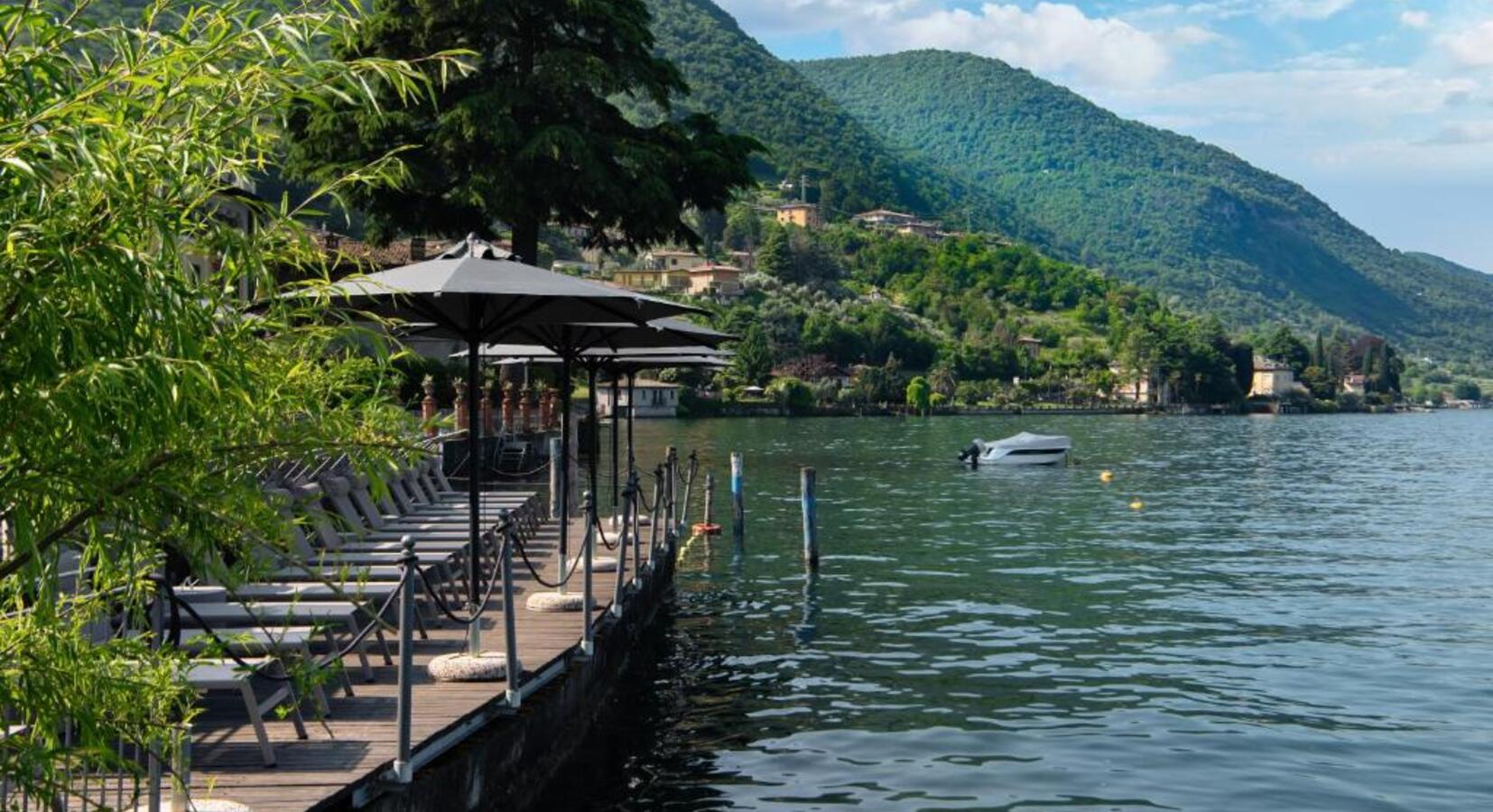An elegant lawn, with palm trees shading a variety of seating options to fit the hour, slopes towards the lake. The heated outdoor swimming pool beckons and swimmers and canoers launch from the floating pontoon. Lunch at the hotel’s La Colazione consists of a confident menu that includes grilled fish and tropical salads. Sit on a velvet seat under a glass veranda overlooking the lake and the mountains with their sloping grass meadows and steep Alpine ravines. So dreamy and mesmerising right on the water’s edge.