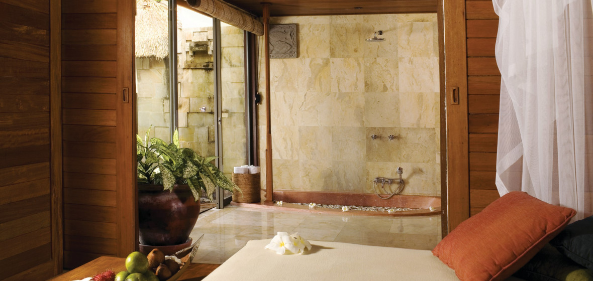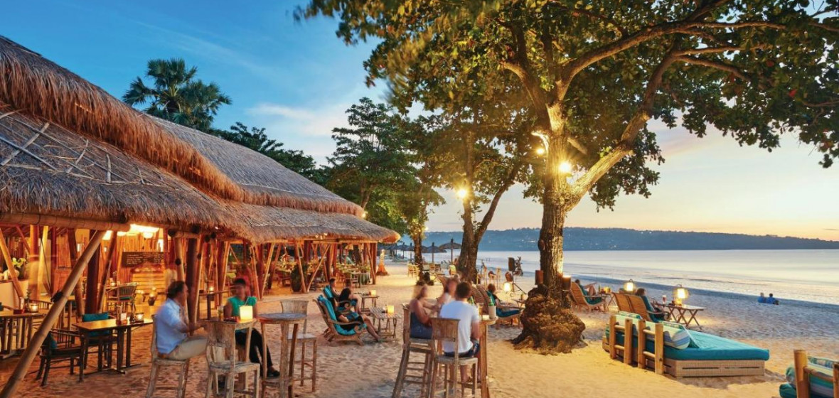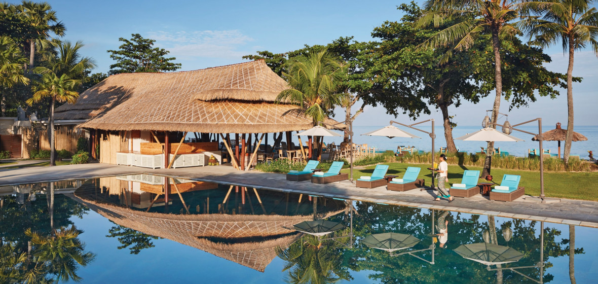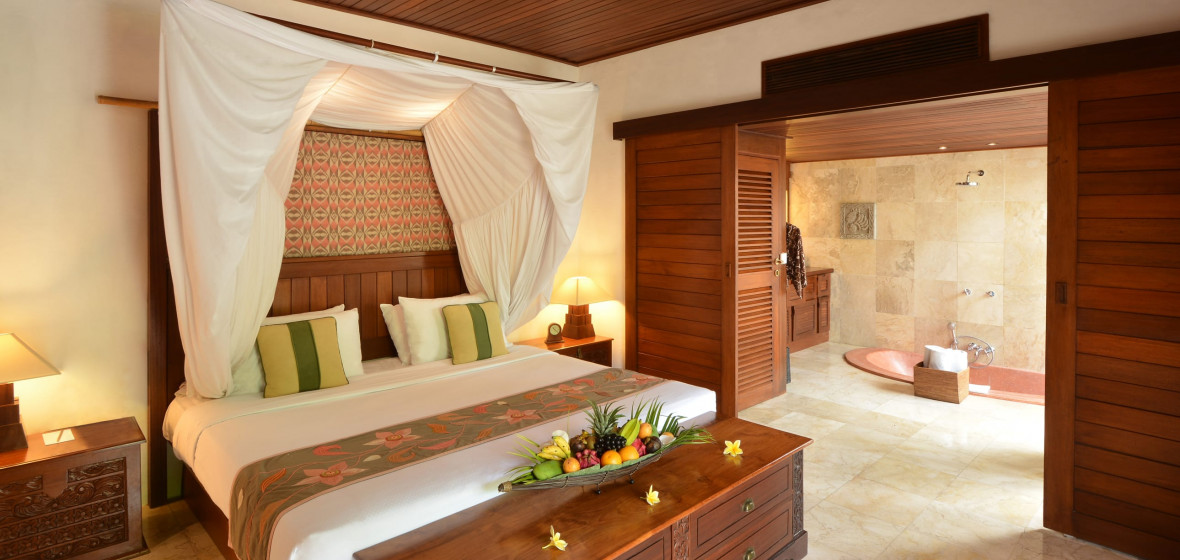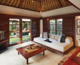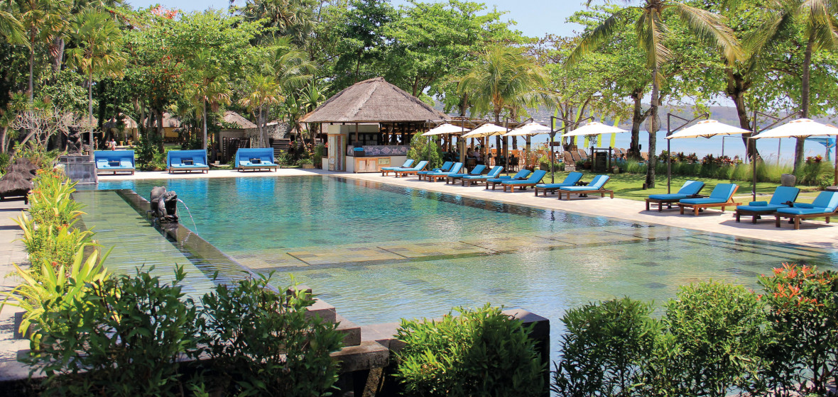 Located on the beautiful beachfront of Jimbaran Bay, the luxury resort of Jimbaran Puri has breathtaking, uninterrupted sea views. Towering palms shade lush tropical gardens, where winding pathways connect the 42 garden-view and beachfront cottages with the 22 new luxury pool villas set deeper within the property. The cottages are decorated in traditional Balinese designs from timber and marble with high ceilings and open-beam thatched roofs, and each cottage has a private walled garden and terrace. The spacious villas have their own gardens, thatched bales and private sunken swimming pools surrounded by hardwood decks, perfect for complete seclusion. The hotel's two restaurants can prepare Balinese, Indonesian and French Mediterranean cuisine.
