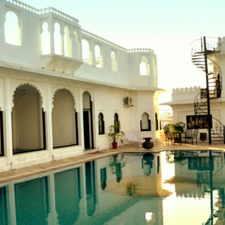Set on a hill in the less touristy Hanuman Ghat, this haveli is more secluded than most. Built in 1820 as the home of the Rajput Karohi family, it was converted into a hotel in 2006, but the design remains traditional: you can’t miss the vast, intricately carved wooden haveli doors and exquisite frescoes above. The courtyard effuses peace and quiet: a fountain creates the tranquil sound of water; there are trees and tropical plants, and sculptures of horses and prancing deer. Remnants of a lost era are everywhere: a centuries-old saddle, a gramophone and photographs of Maharaj Vijay Singh ji Karohi (with his magnificent beard) and Maharaj Dr Sangram Singh ji Karohi. The detail extends to the winding staircase and corridors, where there are old chests, copper pots, ornate mirrors and antique benches. The 26 spotless rooms have king-sized beds, large arched windows, white walls, marble floors and heavy haveli doors. Book one that’s east facing, so you can watch the sun rise over the lake, Lal Ghat and the City Palace. Bathrooms are stylish with black-marble basins, white tiles and signature shower gel and shampoo. There’s also a swimming pool and a rooftop restaurant, which serves delicious Rajasthani classics in cool copper dishes.