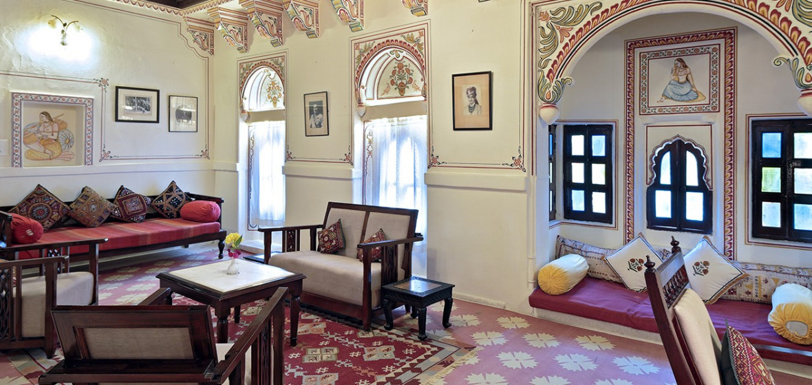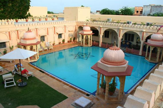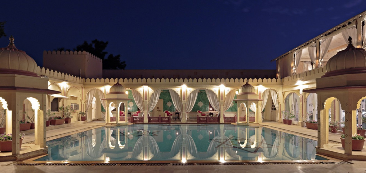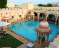 If horse, jeep or camel riding in the desert takes your fancy, as well as exploring the city, this is the place to be, 40 miles from Jodhpur. Owned and run by the Singh family, descendents of the Rathores who built the forified desert house 375 years ago, it is an immediately welcoming haven in traditional Rajput style, providing personal yet never intrusive service, plus marble floors, hanging chairs, charming bedrooms and attractive decorative details. Set by a lake teeming with bird life it has shady verandahs and cosy corners in which to relax with a book, and spectacular lawn echoing to the sound of strutting peacocks. Remember to pack a warm jumper because mornings and evenings in the popular winter months can be chilly.