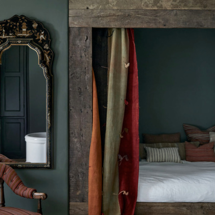 "Inlaid mother-of-pearl furniture from India in the bedroom, enchanting hand-made wallpaper depicting English eccentrics on the walls of the bathroom."