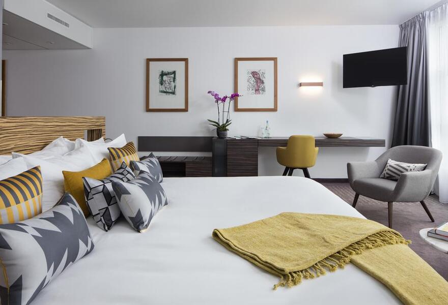 Spectacularly modern and spacious suites in a large hotel. Michelin starred restaurant, extensive spa, and excellent meeting rooms. Fantastic penthouse suite at the top. Ideal for any modern city visitor. Stylish and gourmet.