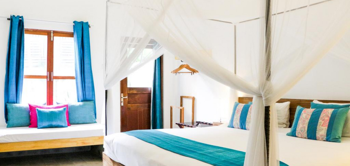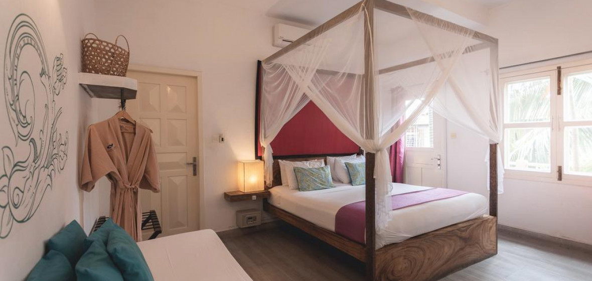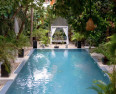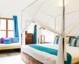 Entering the lobby, exposed stone walls are set off with acquamarine hues, giving the sensation of being somewhere underwater. The clever use of lighting - with a lightbox which provides backlighting to the reception area and soft wall lights - makes this a warm space which invites you to relax as soon as you arrive. Guestrooms are airy and bright, featuring wooden four-poster beds hung with muslin drapes and splashes of lime green in the soft furnishings. Book a luxury suite for a private patio plunge pool, perfect for cooling off on hot days. If your budget doesn't stretch that far, don't worry - the hotel has a swimming pool for guests on the rear terrace, lined with cosy cabanas for romantic lounging. Poolside cocktails are, of course, a must.