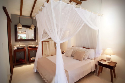 Beautiful wooden casas decorated with Brazilian art and antiques sprawl through a luscious shady garden. Barefoot luxury for couples, families, or any beach break.