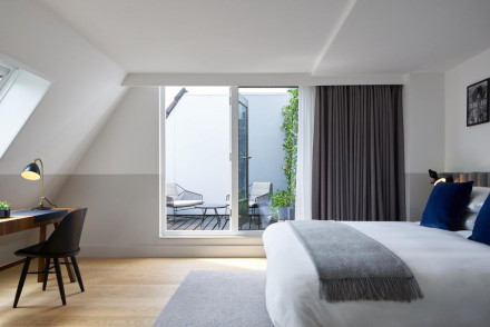 A chic modern hotel in a 19th century townhouse on a residential street right in the heart of the city. Interiors are fresh and contemporary with interesting works of modern art, plenty of light, and unique design pieces. A courtyard garden, honesty bar, and bike rental makes this an easy city base.