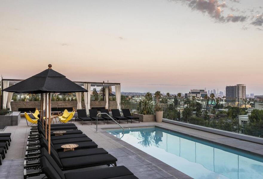 • Swimming Pool - The heated rooftop pool offers panoramic views of the Hollywood Hills and downtown LA, with loungers and a private cabana.