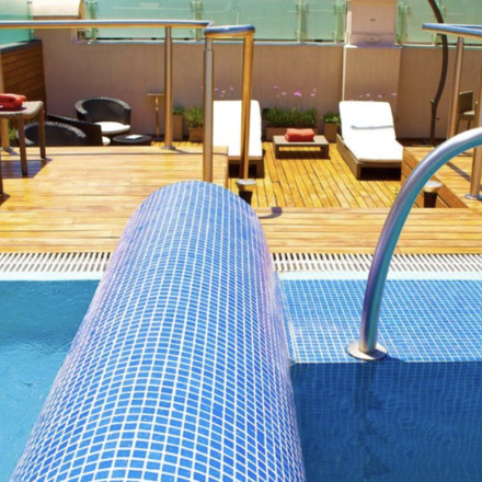 Magnificent views from the Sky Bar, swimming pool, deck chairs.Good wine list
