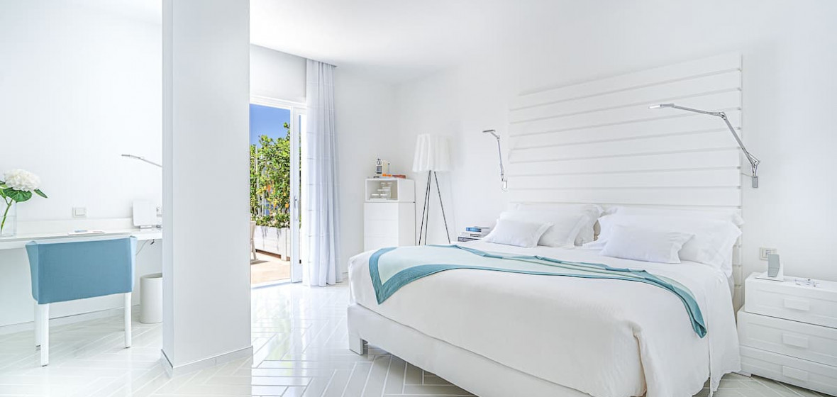 Five miles from the centre of Positano the dazzling white, art-filled Casa Angelina sits majestically on the cliff top overlooking the sparkling Mediterranean. This 30-room boutique hotel is a seriously cool property, ideal for couples looking for a contemporary designer vibe.