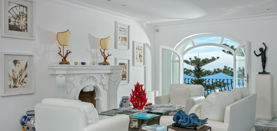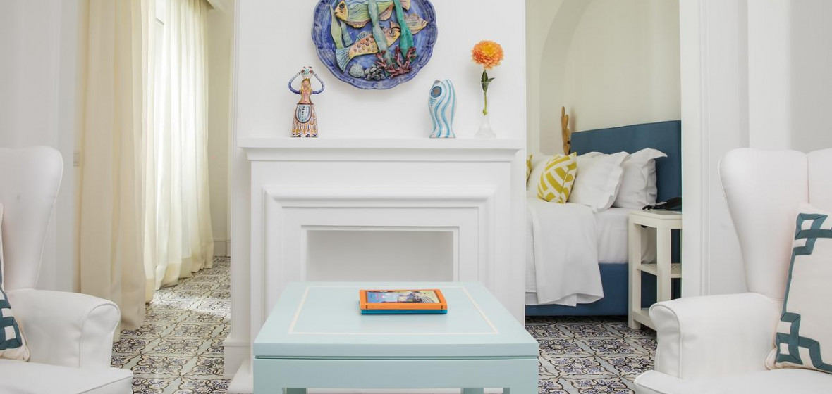 “Set in a tranquil garden of deliciously scented mimosa, almond and citrus trees. Spread over five terraced levels inching towards the sea with sweeping arches, cross-vaulted ceilings and majolica-tiled floors. Light and sunny rooms in blues and whites. A great choice for an intimate escape.”
