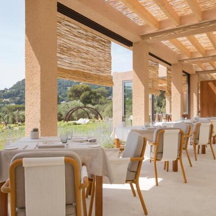 Sublime, uber stylish 5 star luxury retreat is immersed in nature with 2 infinity pools (voted by Mr & Mrs Smith as one of 10 best infinity pools in the world) and a private beach overlooking the Mediterranean. Private bungalows using natural materials and incorporating hi tech features, offers minimalism and absolute peace. It's next door to big sister Can Simonetta if you want a change of scene during your stay. Good for couples and solo guests (adults only) who favour a hip, sophisticated hotel with delicious food (Marc Fosh, Michelin starred, is the executive chef) and faultless service. Individual staggered natural stone bungalows each with a private courtyard and terrace, are integrated into the heavenly landscape punctuated with pine and olive trees and wild grasses overlooking the glistening sea. Using the theme of nature, all natural materials are used - hessian lamps with coiled rope bases, bamboo ceilings and blinds, stone or pebble floors, wooden doors, tree trunk tables, woven string headboards backing super kingsize beds and wafty linen curtains. The lateral architectural design of the buildings cleverly emphasise a unique sense of expansive space and openness. Guest houses have a wonderful cocoon-like feel with well designed bathrooms fitted with double basins, large designer oval bath tubs, indoor and outdoor showers. The 50-strong team of staff go the extra mile to help. An idyllic place to unplug and disconnect. Unforgettable.