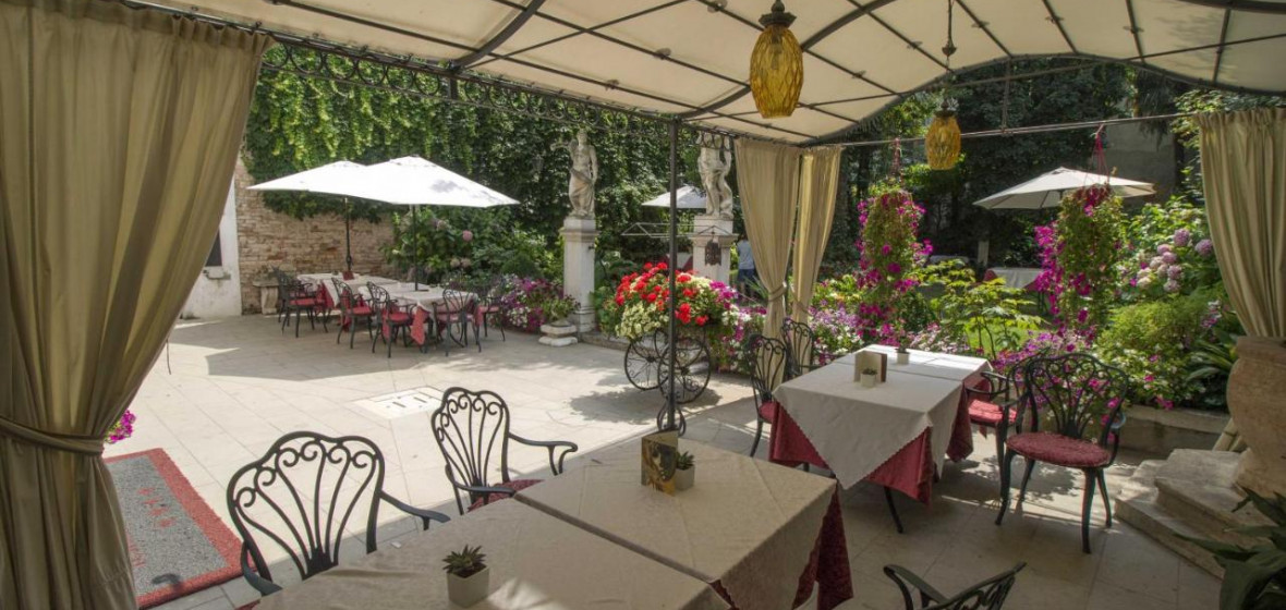 “Restored 16th-century palazzo with spacious frescoed rooms, full of antiques and Murano glass. Bursting with history and character. Four poster beds, heavy curtains and patterned wallpaper adorn the rooms. Drinks are served in a walled terrace with shaded seating. Truly regal living.”