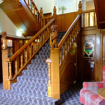 "The oak-panelled entrance hall and staircase have been handsomely restored and period details are scattered throughout the original part of the building."