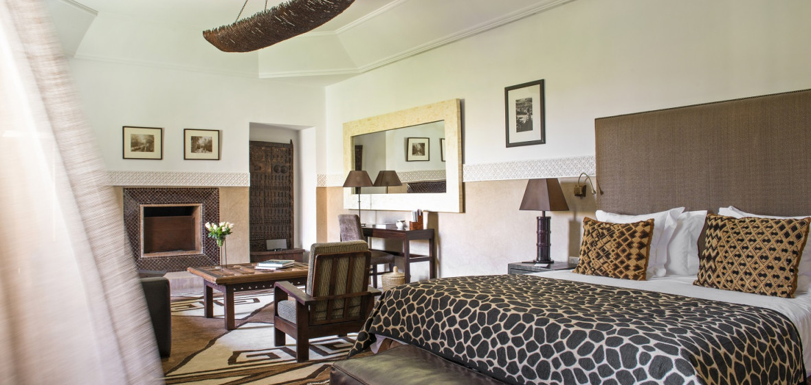 Beyond the atmospheric little reception area lies a gorgeous interior courtyard (the first of many) with central fountain gently tinkling away in the background. Then the fun starts; working your way around this rabbit warren of a property filled with wonderful little nooks and crannies that have leather chairs, comfy sofas, beautiful objets and stunning statement light fittings, just made for passing lazy days (and when it’s cold, a cosy, welcoming fire will be there to greet you too). The property itself dates back to the 1930s, though you’d be forgiven for thinking that it was much older due to the stunning interiors; think intricate ceilings, authentic woodwork, and beautiful wood panelling. It was converted from riad/home to a luxury hotel in 1998 and has maintained its top notch level ever since.