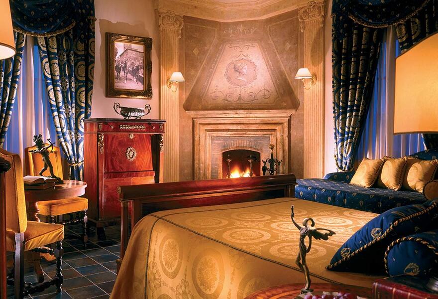 A quintessentially noble Roman townhouse renovated to perfection. Tranquil, classic, and aristocratic rooms, suites, and living areas in a peaceful neighbourhood. Marble fireplaces, oil paintings, Doric columns, and tapestries throughout. Excellent food, libraries, gardens, and a spa. Very special.