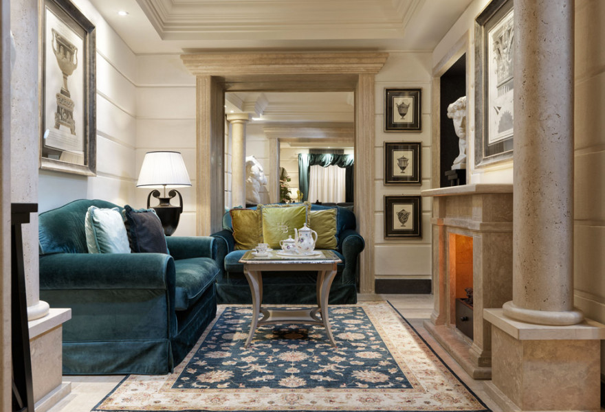 A quintessentially noble Roman townhouse renovated to perfection. Tranquil, classic, and aristocratic rooms, suites, and living areas in a peaceful neighbourhood. Marble fireplaces, oil paintings, Doric columns, and tapestries throughout. Excellent food, libraries, gardens, and a spa. Very special.