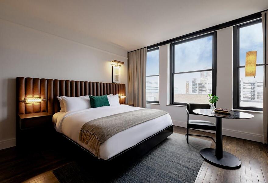 Contemporary-luxe downtown hotel in iconic Beaux-Arts property. Mid-century interiors give a sleek fresh feel to rooms and suites while double-height ceilings and crown moulding create a welcoming light-filled lounge. Enjoy cityscape views and atmospheric dining at tavern-style restaurant and bar.