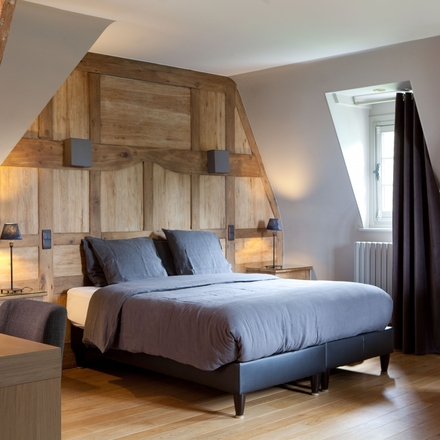 “A delightful timbered farmhouse with a fantastic regional restaurant. Rustic chic interiors with high wooden beamed ceilings and lots of light. Rooms, suites, and family suites are wood clad with simple modern furniture. A peaceful rural setting for families, groups, or friends. ”