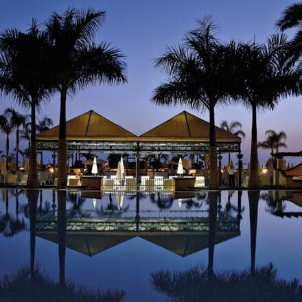 "Inside, the expansive lobby has stone and mirrored surfaces which enhance the already large space. Centre stage is a waterfall above which is a glass-bottomed swimming pool."