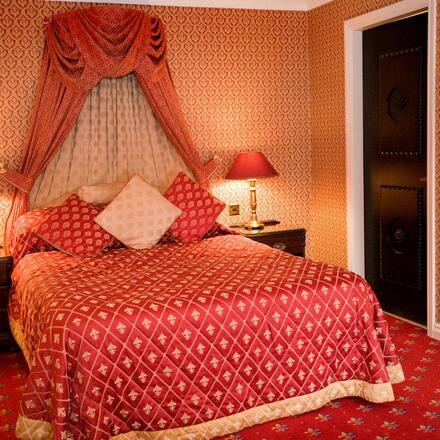 Want to feel like a medieval Lord and Lady? Half-close your eyes, and you pretty much can in this striking castle with its battlemented roofline, corner towers and massive walls. Step inside, and the feeling is reinforced with feet-thick stone walls, wrought-iron candelabras hanging from the ceiling, gilt-framed portraits and tapestries lining the walls, suits of armour and heraldic shields at every turn, and a creaking oak staircase. Admittedly, much of the decoration and furnishings is reproduction but it adds to the atmosphere, and the ruby-red swags, sofas and carpets add to the richness.