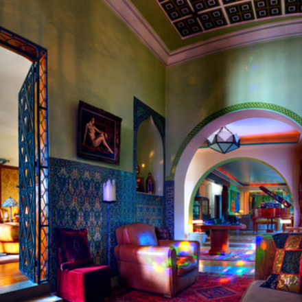 There are no fewer than four public areas: the gallery, where a dining table and grand piano are dwarfed by panels of four larger-than-life art deco nudes; a dazzling Moroccan den; the Majorelle room, named after turn-of-the-century cabinet maker Louis Majorelle; and the art deco library, now boasting a huge billiards table. Period artworks vie for attention with paintings by contemporary artists.
