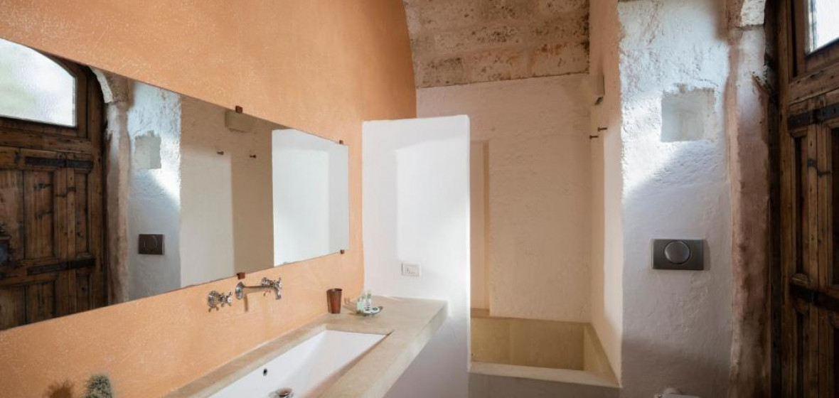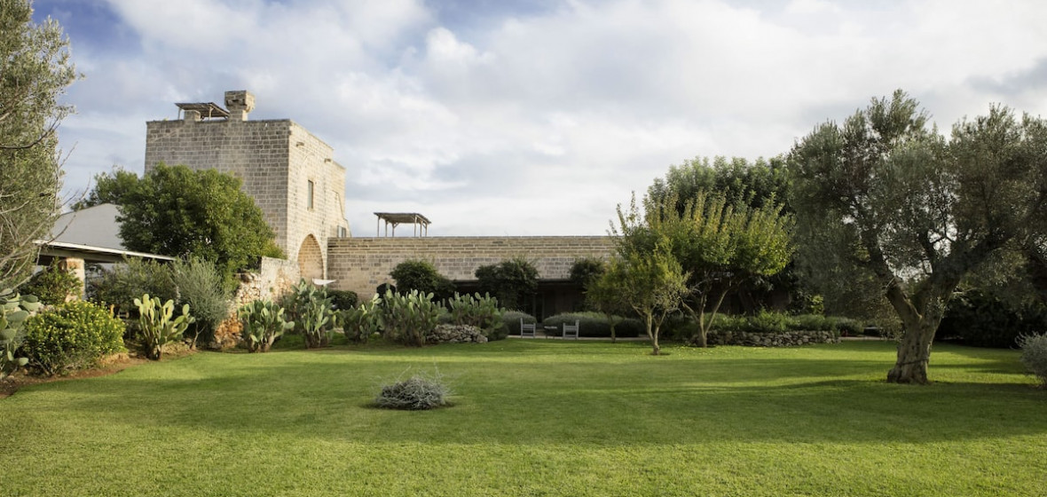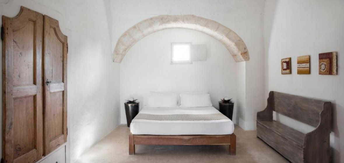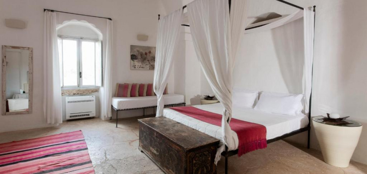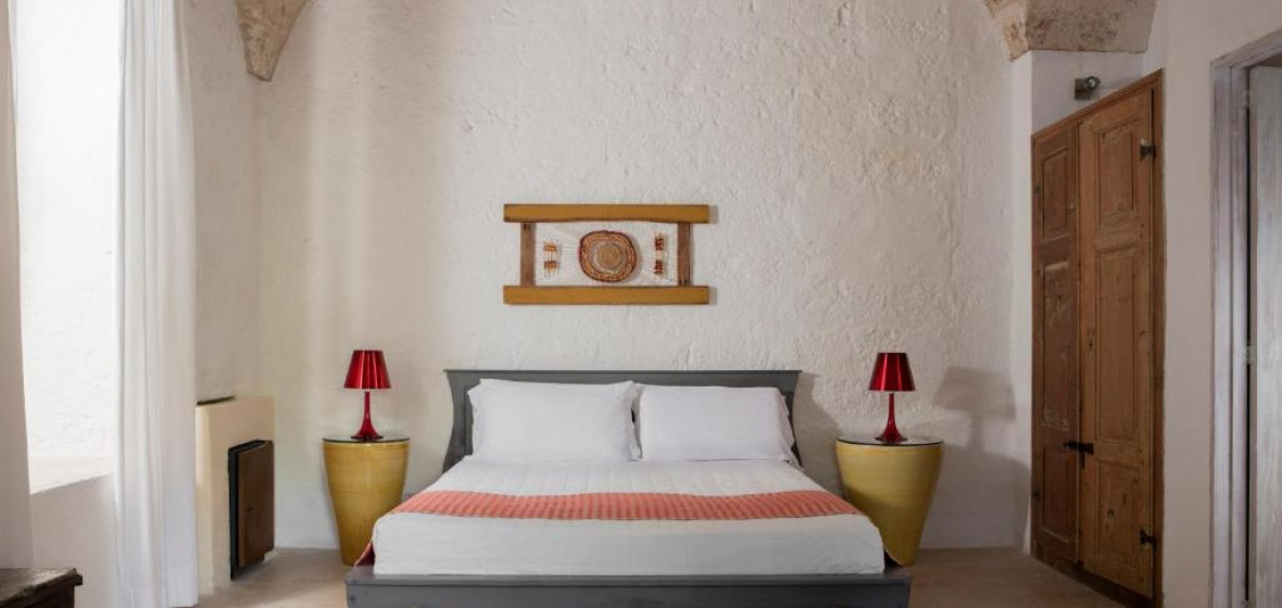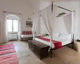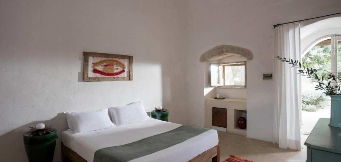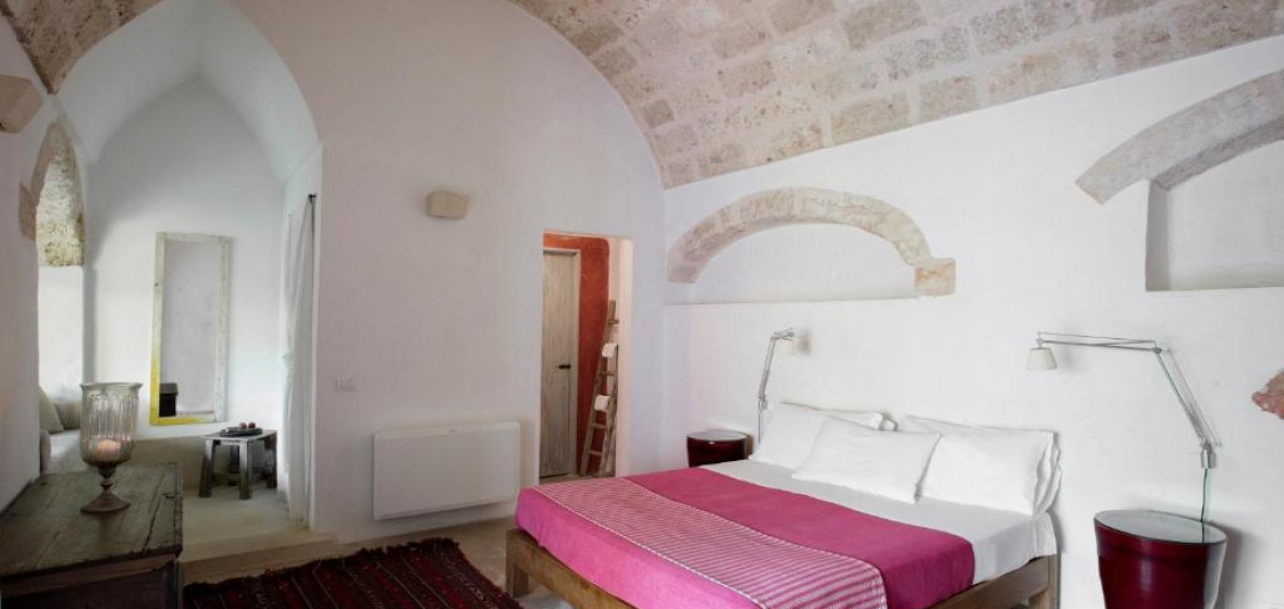 This 15th century brick masseria stands in a beautiful walled garden set in a landscape of endless olive trees just 2 kms from the sea. Two suites are housed in the original tower; the other seven bedrooms are in low adjacent outbuildings. They are done out with simple good taste with an ethnic slant; kilims and colourful bedspreads are set against white walls and bare stone vaulted ceilings. Public space is limited to the garden where comfy chairs are arranged under trees and wine coloured umbrellas shade the pool area.