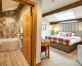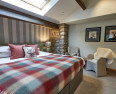Bedrooms have a modern rustic look with chunky-wood furniture, colourful blankets and jolly prints of farmyard animals. Some rooms are beamed, others have low windows, and all are nicely uncluttered. Home-made biscuits, fresh milk plus White Company products in the modern bathrooms are nice touches. The eight rooms in the separate barn, a two-minute walk across the beck, are generally larger and share a large living space. But you need a good torch for the night-time walk to the pub for evening meals.