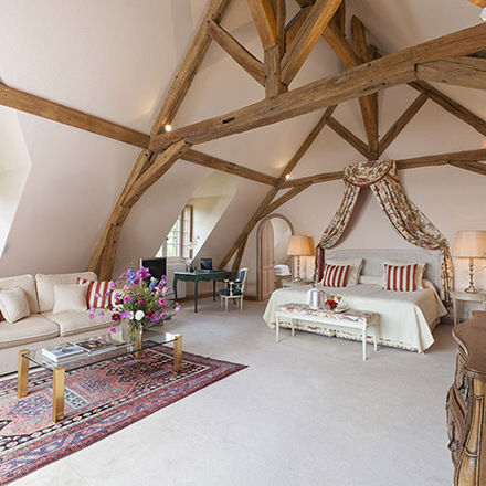 Esta hermosa propiedad está ubicada entre Blois y Tours, cerca del pequeño pueblo de Onzain, y está rodeada por 70 hectáreas de bosque cuidado. Es el lugar perfecto para descubrir los viñedos de Vouvray, entre otros, y visitar los numerosos castillos famosos del Loira. Los terrenos son perfectos para andar en bicicleta, caminar o incluso pescar. El carácter del antiguo edificio se presenta con calma. Exuda la diversión y alegría del pasado. Las habitaciones están en el castillo o en la casa de carruajes. No espere interiores fríos y grises, aquí el énfasis está en el estilo tradicional, lo que simplemente añade al encanto y la experiencia general, y tendrá camas cómodas, hermosos linos y productos Clarins. Es el lugar perfecto para parejas o grupos familiares. Gran piscina, cancha de tenis y petanca, y hay planes emocionantes para instalaciones adicionales en el futuro. Después de toda esta actividad, debemos comer, y decimos 'debemos'. El chef Remy Giraud, con dos estrellas Michelin, transforma lo ordinario en lo sublime. Los superlativos no están fuera de lugar: el más sabroso, el más ligero, el más hermoso, uno podría continuar, y la impresionante carta de vinos es accesible y bien valorada. No es sorprendente que con toda esta experiencia culinaria y hermosos jardines de vegetales, haya una impresionante escuela de cocina que abrió en 2016. Ubicada en un maravilloso espacio detrás de la casa de carruajes hay una sala luminosa y aireada con todo el equipamiento necesario para preparar platos fabulosos bajo la atenta mirada del Chef Rémy Giraud. Alumnos desde los 5 años en adelante: hay esperanza para todos nosotros.