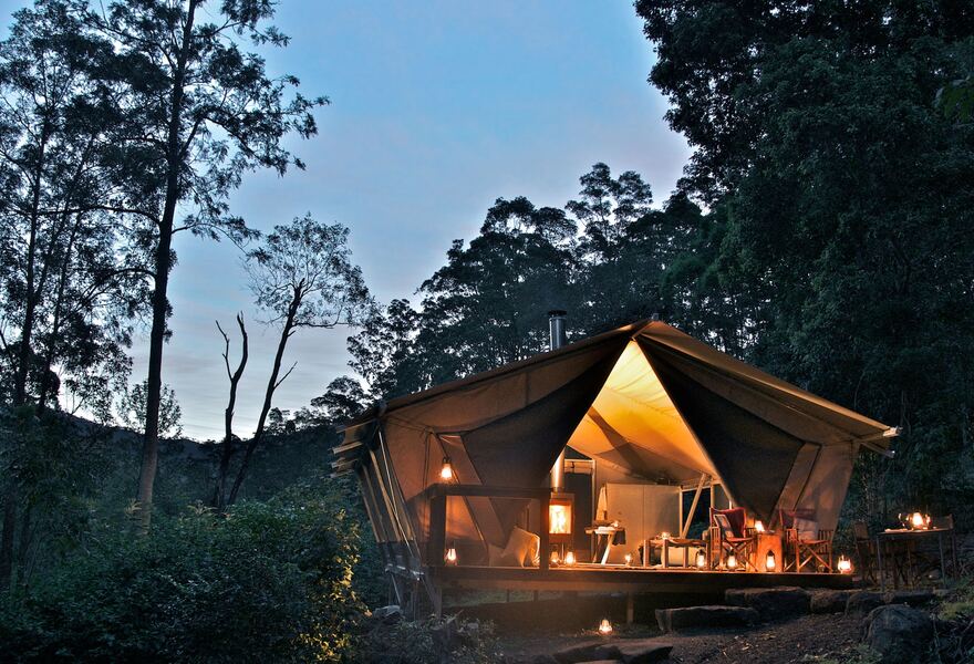 Une éco-retraite exceptionnelle pouvant accueillir seulement 8 adultes dans d'énormes tentes construites à la main face à Christmas Creek. Les cachettes de glamping disposent de grands lits douillets, de poêles à bois, de baignoires jumelles et de balcons. Le salon dispose d'une petite bibliothèque et la cuisine biologique cuite au feu de bois est fabuleuse. Un joyau dans la nature.
