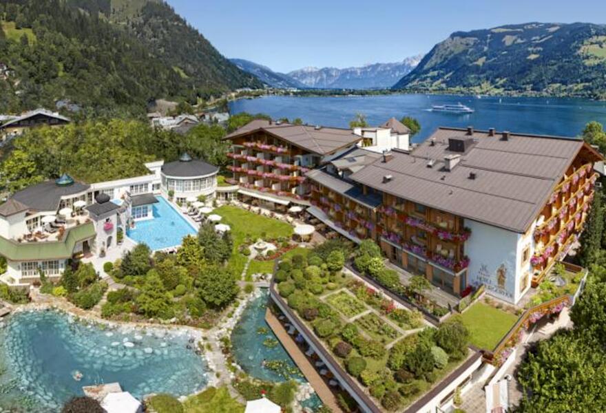 Un grand hôtel de luxe entouré de montagnes et de lacs à Zell am see. Les chambres sont meublées de façon opulente, évoquant le style d'une maison de campagne, avec des sols recouverts de moquette, des canapés confortables et des cheminées. Un restaurant primé, une superbe carte des vins, un spa, des jardins et des piscines. L'escapade parfaite.