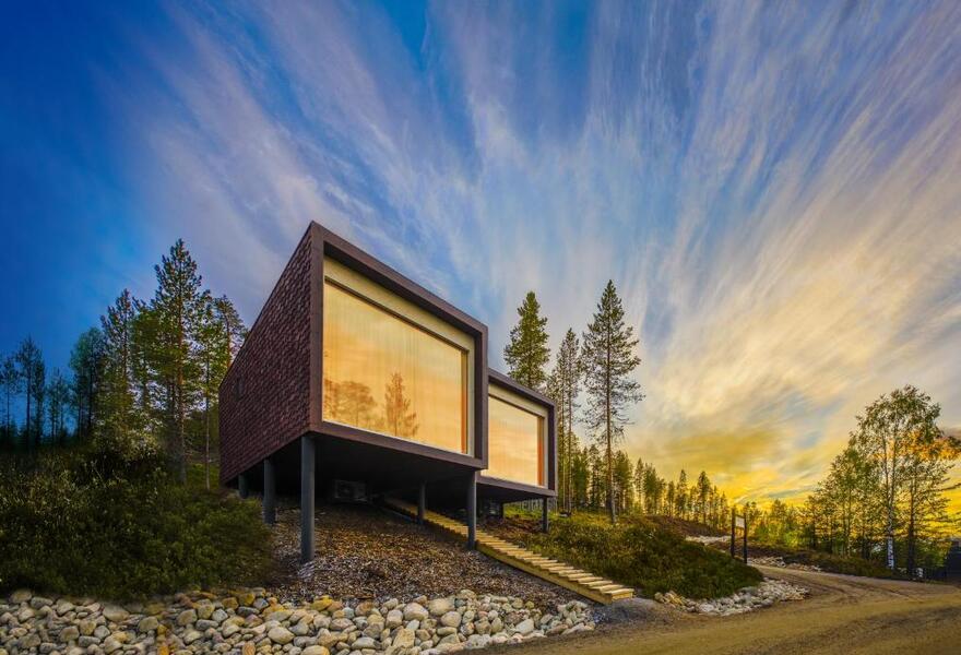Cette cabane élégante offre une vue imprenable sur la forêt et le ciel environnants, dans le cercle arctique finlandais. Les intérieurs présentent un design scandinave minimaliste avec des touches douillettes comme le bois, les fourrures et les fenêtres allant du sol au plafond, ainsi qu'un restaurant, un bar et un sauna exceptionnels. Nature et luxe.