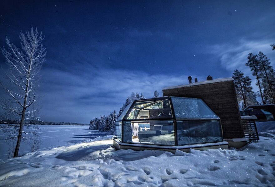 Une escapade arctique nichée dans la nature enneigée de la Finlande, avec des igloos en verre confortables, des intérieurs scandinaves et des vues panoramiques. Les hôtes peuvent profiter de l'émotion de dormir sous les aurores boréales, et disposent d'un sauna privé et d'un restaurant à proximité. Une retraite magique mêlant nature et luxe nordique.