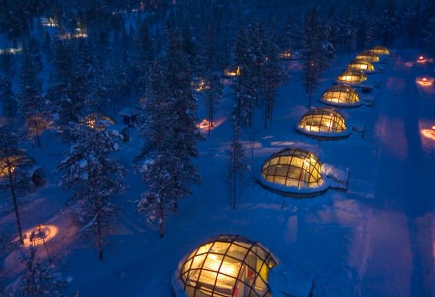 Une escapade chic au cœur de la Laponie finlandaise, entourée de la nature sauvage de l'Arctique. Les igloos douillets à dôme de verre présentent un design nordique avec des intérieurs en bois épurés et une literie moelleuse. Vous pourrez profiter de bains à remous, de vues panoramiques et d'un restaurant servant des spécialités locales. Un mélange magique de luxe et de nature.
