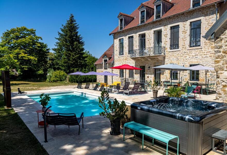 Une escapade idyllique alliant charme traditionnel et design épuré et moderne, dans la région du Jura, en France. Les intérieurs présentent des murs en pierre naturelle, du bois apparent et un confort contemporain. Les clients peuvent déguster une cuisine française raffinée, se détendre au bord de la piscine ou explorer les jardins tranquilles. Une image parfaite.
