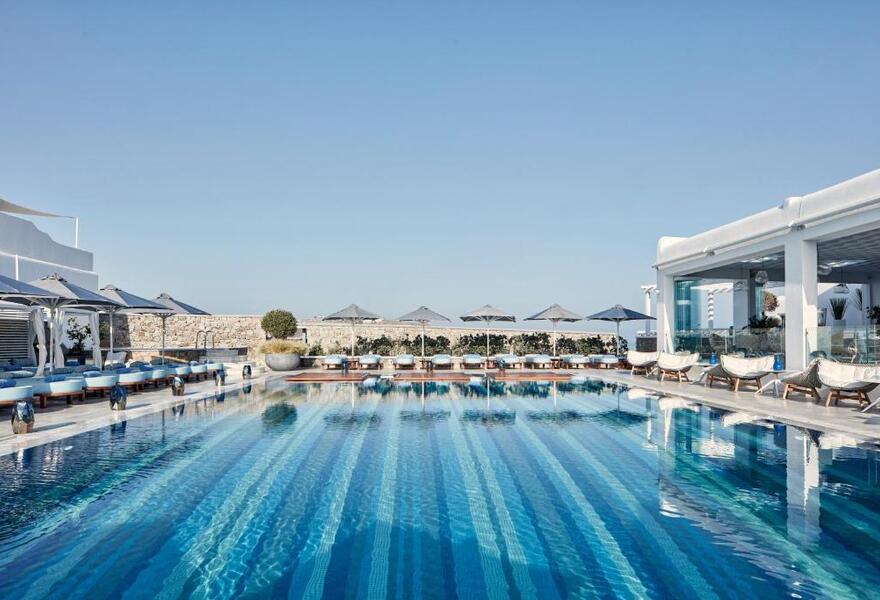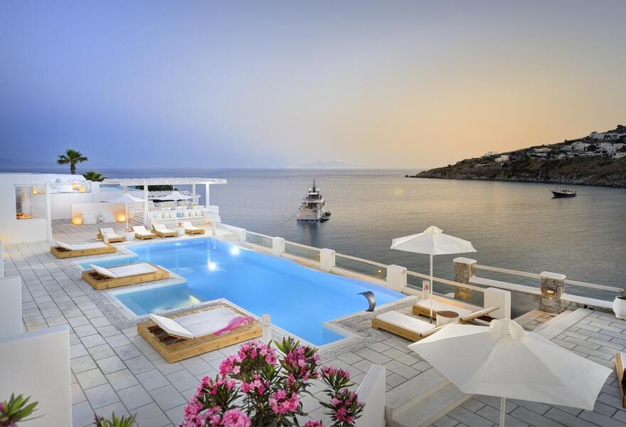 Ce charmant hôtel de charme cinq étoiles se trouve sur les rives sablonneuses de la plage d'Ornos, à Mykonos. Les chambres élégantes présentent un intérieur blanc sur blanc avec des touches de bleu et de gris. Certaines disposent d'un balcon privé avec bain à remous et vue sur la mer. Les restaurants sont excellents et le spa est très apprécié des locaux.