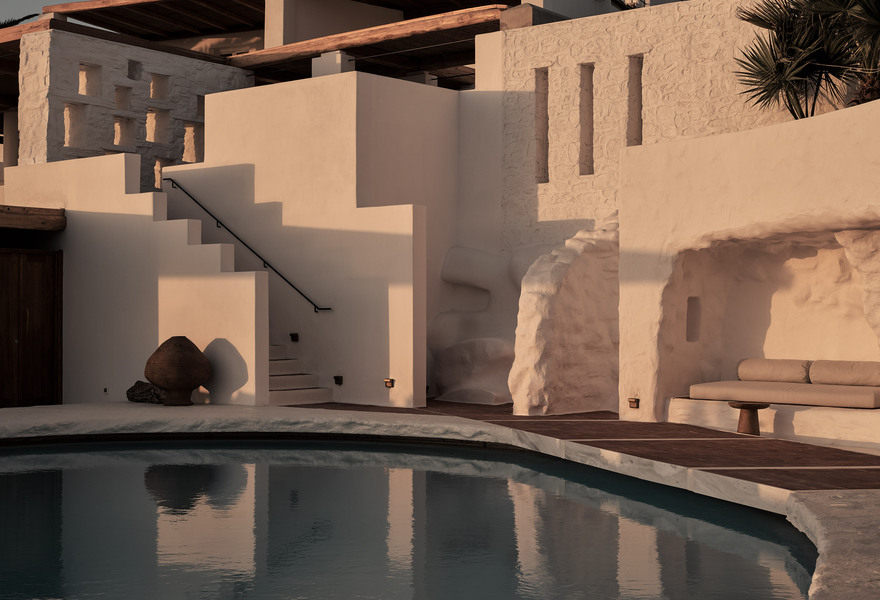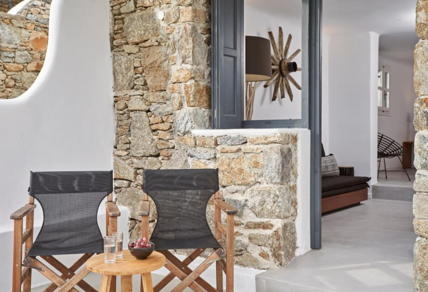 Cet hôtel de charme ne compte que 13 chambres et suites offrant une vue imprenable sur la mer Égée, au-dessus de la plage d'Agios Stefanos. Les intérieurs sont élégants et chics, mêlant la pierre des Cyclades au minimalisme moderne dans des tons blancs, beiges et noirs. L'hôtel dispose de piscines privées, d'une piscine à débordement luxuriante et d'une cuisine méditerranéenne dynamique.