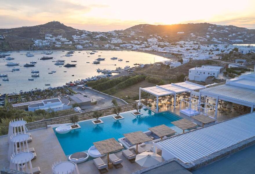 Une oasis de calme, blanche, lumineuse et décontractée. Chambres luxueuses et chics avec salles de bains contemporaines, certaines suites sont dotées d'un bain à remous privé. L'hôtel jouit d'une vue imprenable, d'un spa luxueux et d'un restaurant raffiné. La proximité de la ville de Mykonos en fait l'endroit idéal pour ceux qui souhaitent allier détente et vie nocturne.