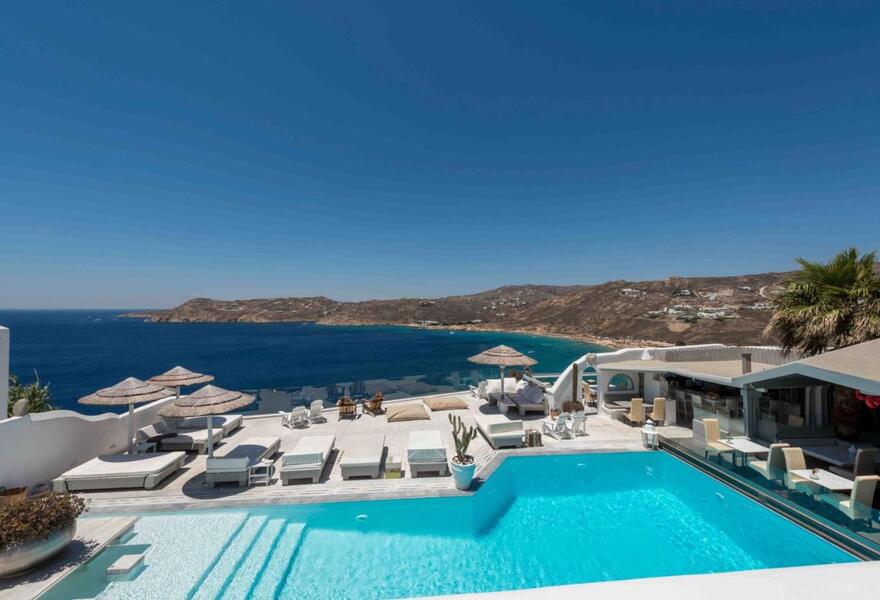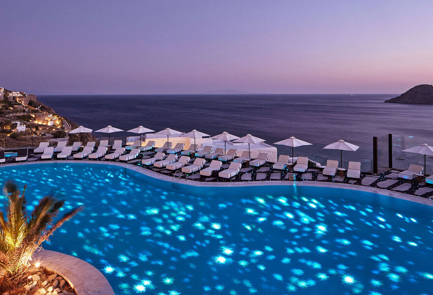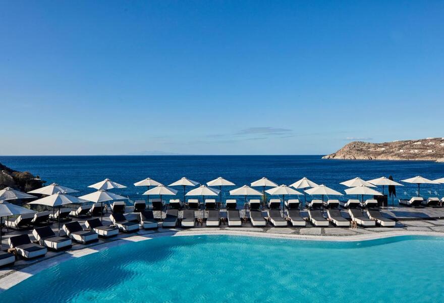 Ce complexe luxueux récemment rénové se trouve sur sa propre péninsule à couper le souffle, sur l'île branchée de Mykonos. Des vues panoramiques sur la mer entourent l'hôtel et la piscine à débordement, tandis que les repas VIP sont accompagnés par des DJ célèbres. Les chambres, suites et villas sont contemporaines, élégantes et spacieuses.