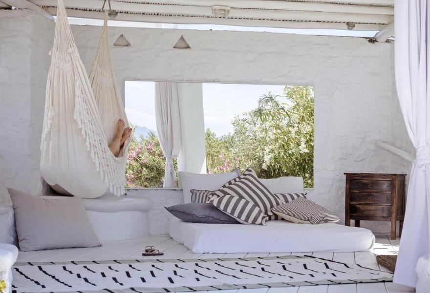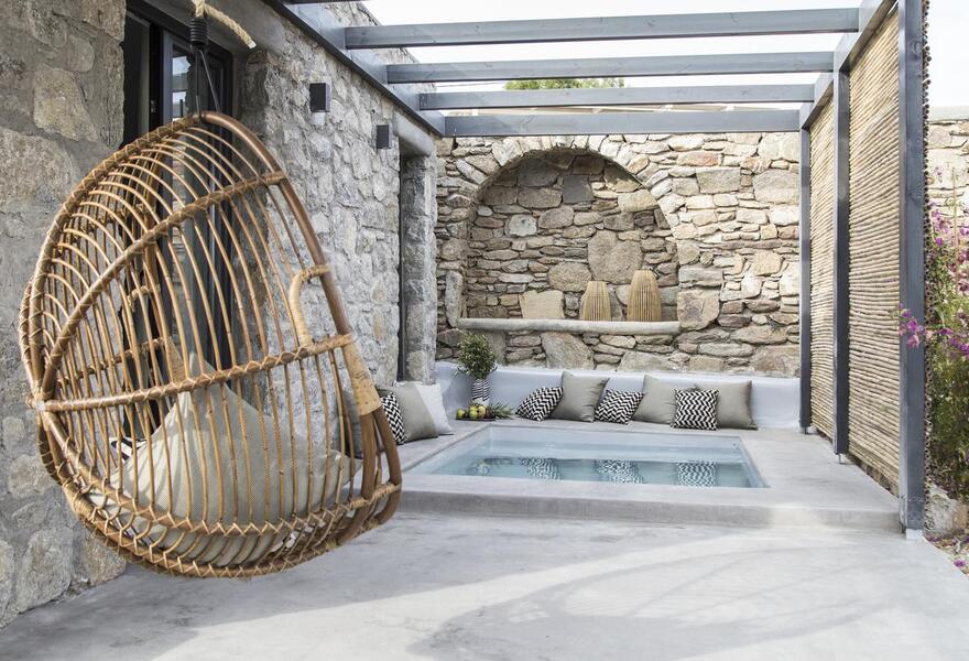 Situé à quelques pas du centre-ville de Mykonos, ce nouvel hôtel de luxe allie l'architecture grecque traditionnelle au design contemporain. Les têtes de lit en textile suspendu et les cloisons en roseau contrastent avec une palette classique de gris et de blanc dans les suites-boutiques, idéales pour des vacances en couple.