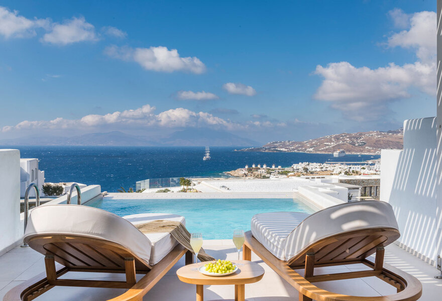 Cet hôtel cinq étoiles, membre de Relais & Châteaux, propose des chambres luxueuses et contemporaines, avec un design blanchi à la chaux et des lits moelleux. Un certain nombre d'entre elles disposent d'une piscine et d'un bain à remous privés et jouissent d'une vue panoramique sur la mer Égée. Le pont de la piscine est très branché et l'ambiance y est très agréable.