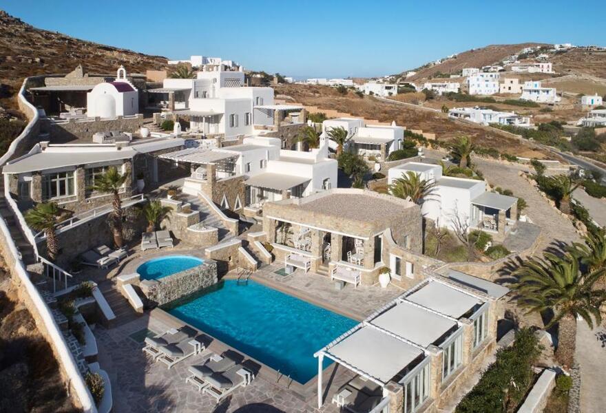 Cet hôtel de caractère est situé au sommet d'une petite colline surplombant la ville de Mykonos et la mer. Les chambres et les suites sont de style simple avec des sols en bois poli, des murs blanchis à la chaux et des portes-fenêtres donnant sur des terrasses. La cuisine grecque est servie avec vue et une grande piscine permet de se détendre. Luxueux mais décontracté.