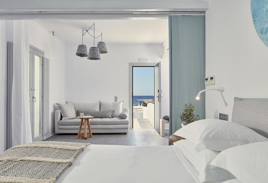 Cette boutique chic se trouve à la périphérie de la ville de Mykonos. Les fabuleuses suites sont dotées d'un mobilier contemporain cool dans un style minimaliste blanc sur blanc typiquement grec, avec des balcons privés et des vues époustouflantes. Le restaurant sert une cuisine grecque moderne avec vue sur la mer Égée et les cocktails sont à tomber.