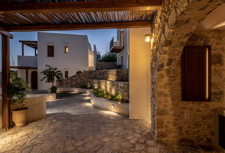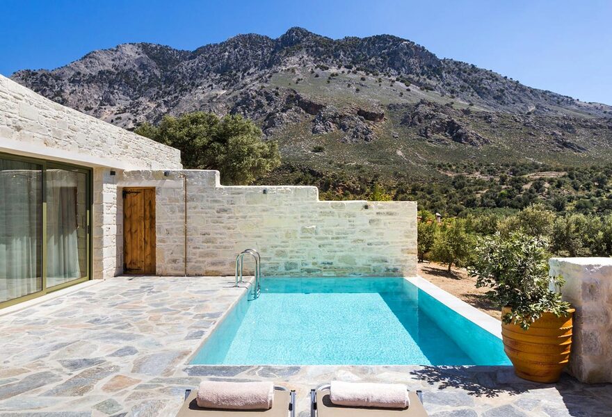 Un pressoir à olives rénové datant du XVIIIe siècle et les bâtiments environnants présentent une architecture crétoise simple : murs en pierre, arches et poutres en bois avec des intérieurs minimalistes-chic. Les chambres disposent de lits confortables, de canapés et de terrasses privées avec vue. L'hôtel sert une cuisine grecque contemporaine et dispose d'une grande piscine extérieure.