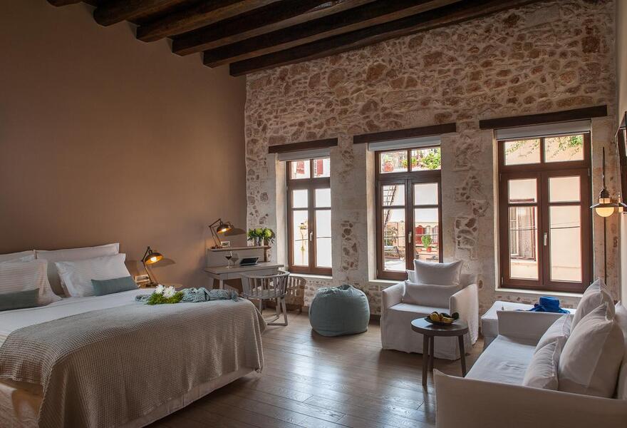 Cet hôtel de charme allie luxe moderne et histoire crétoise authentique, dans le port vénitien de La Canée. Les intérieurs présentent un décor minimaliste avec des murs en pierres apparentes, du bois poli et des tons terreux. Les clients peuvent se détendre dans le spa, déguster une cuisine exceptionnelle dans la cour et se rafraîchir dans la piscine couverte.