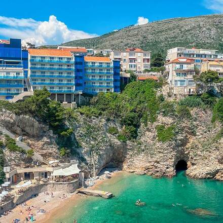 'In a sheltered bay on Lapad peninsular, close to Dubrovnik's old town, Hotel Kompas opened in August 2015 following total reconstruction. The minimalist all-white interiors have contemporary furnishing and fantastic sea views. There are 173 rooms, an outdoor pool, a spa, and a big restaurant with a waterside terrace.'