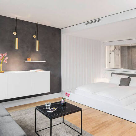 Au nord-ouest de l'Alexanderplatz (ce n'est pas un beau quartier, mais il s'y passe beaucoup de choses), cet immeuble d'appartements reconverti propose essentiellement un studio de taille moyenne, conçu par Constantin Silvestrin & Salmaso, avec une kitchenette et une douche de type forêt tropicale, deux grandes télévisions dans la suite exécutive et un lit très confortable. Au rez-de-chaussée se trouvent un spa et un excellent restaurant fusion japonais/italien à la mode. Ne vous attendez pas à un grand service hôtelier ; c'est plutôt comme si vous séjourniez chez des amis stylistes ; un peu débraillé, mais indéniablement cool.