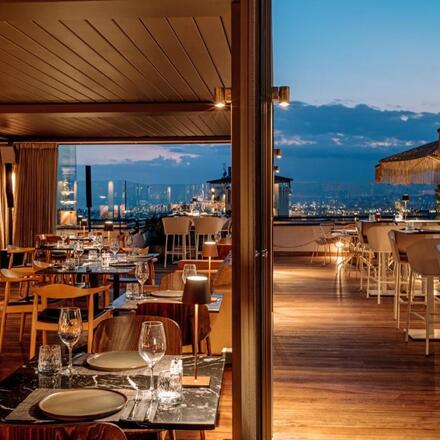 Bar sur le toit de la piscine avec une superbe vue sur la villePiscine