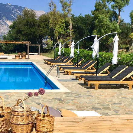 Secluded apartments (for 2-7) set in gardens above a lovely beach, with a swimming pool and a homely vibe; ideal for sociable couples or families.