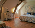 Press a button, and iron gates open to reveal the front door beyond a sweep of lawn flecked with strutting peacocks. A stunning atmosphere is on offer at this wonderful 13th-century moated château where rich and delicious dinners are served, house party style, at a large table in the old kitchen or at separate tables, in fine weather, on the lawn. Some rooms are grand, others homely and comfortable.