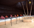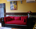 Contrairement à certains riads rénovés de Marrakech, celui-ci présente un agencement inhabituel avec un large escalier menant à des chambres situées à différents niveaux, dont l'un est accessible par un petit pont métallique. Au premier étage, vous trouverez une petite piscine surmontée d'une terrasse ensoleillée et, au sommet de la propriété, un salon et une terrasse sur le toit avec des sièges traditionnels à coussins bas.